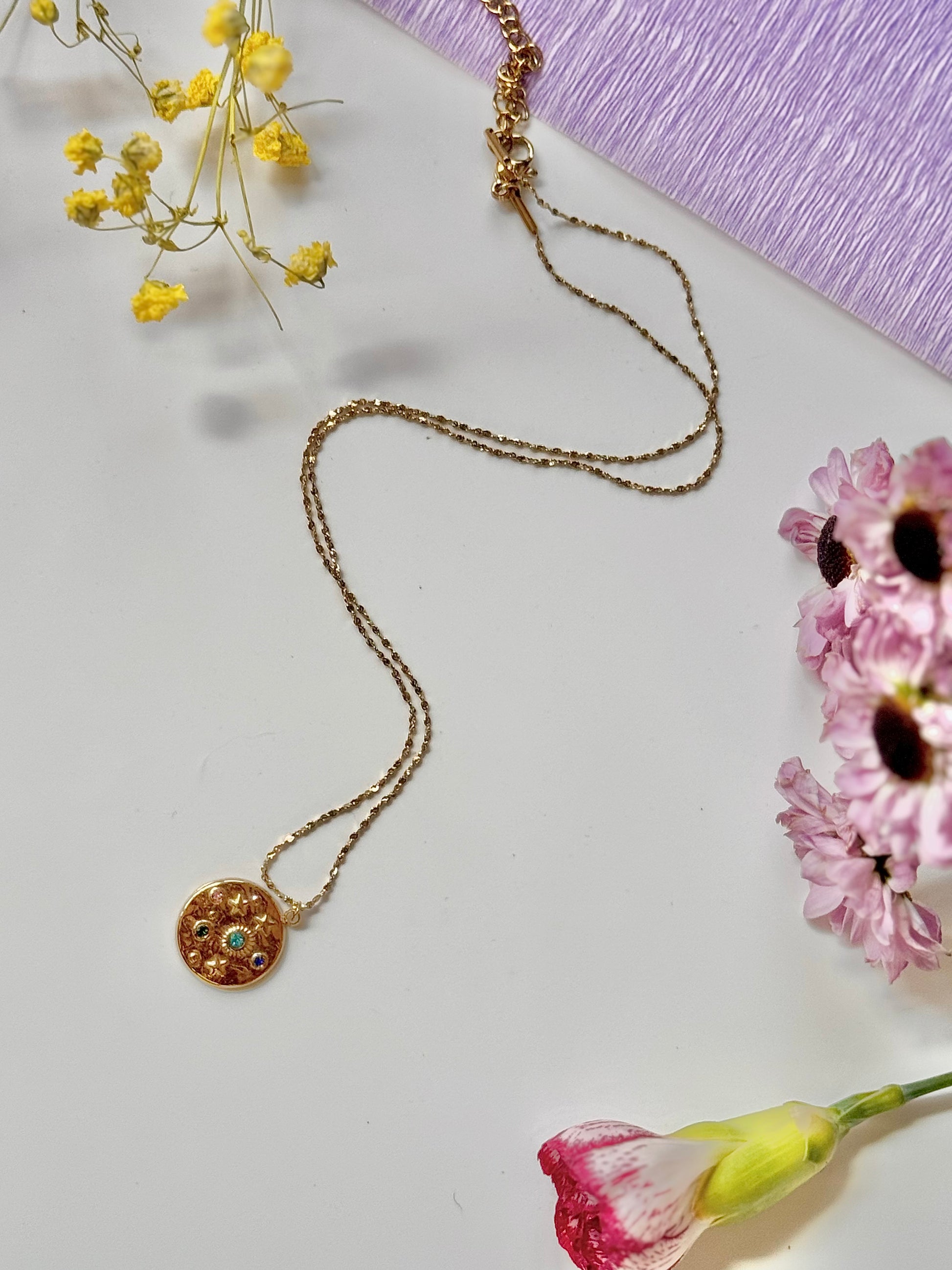 Channel free-spirited elegance with this handcrafted stainless steel necklace, featuring a vibrant, studded star coin pendant that dances with color and light. Designed for the modern bohemian, this piece merges artisan detail with indestructible wearability, perfect for everyday adventures or festival magic.