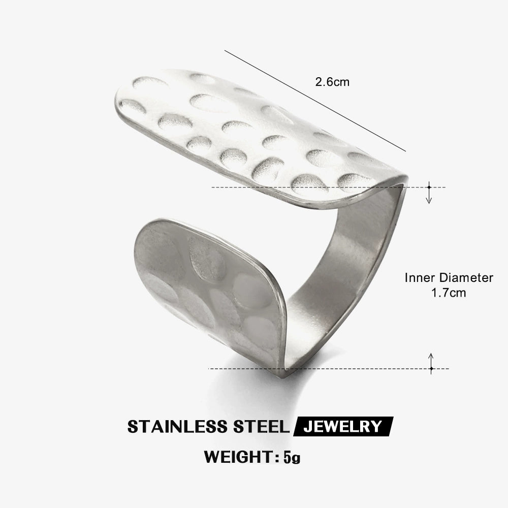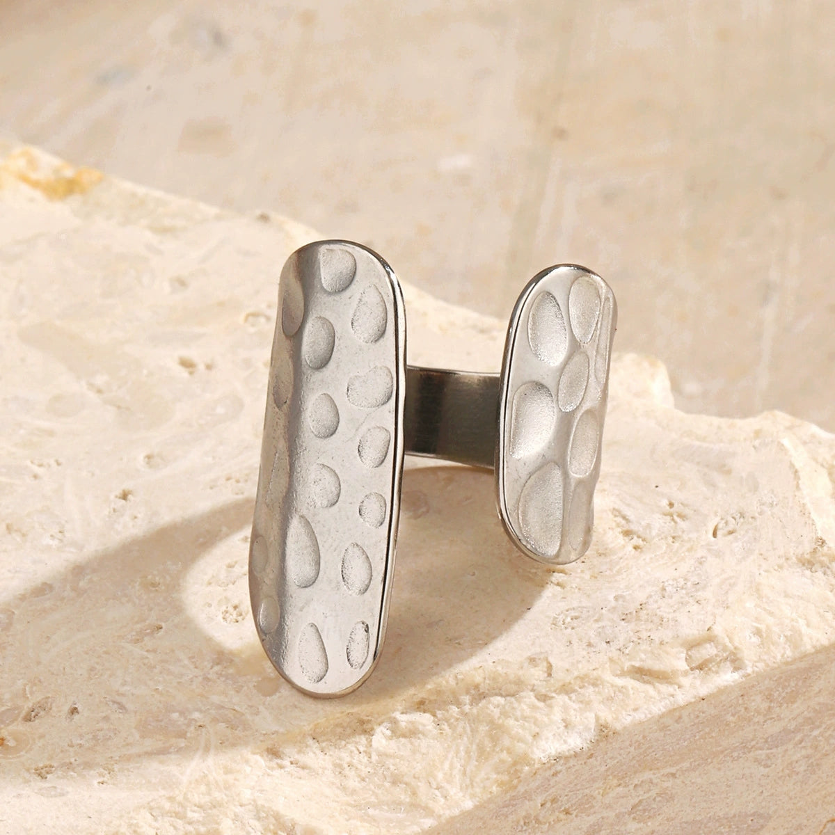 Modern minimalism meets texture. This sleek open ring features a wide bar design with scattered circular indentations that create visual depth and dimension. Bold, architectural, and available in gold or silver—an elevated everyday essential.