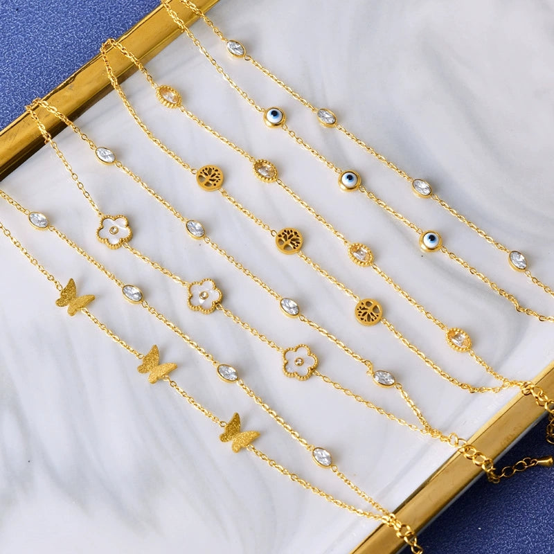 Two delicate chains, endless styling possibilities. This elegant bracelet features dual gold chains adorned with white enamel clover charms and sparkling crystal accents—a design that celebrates luck, beauty, and the layered stories you carry. Wear both chains together for maximum impact or style them separately for a more subtle look.