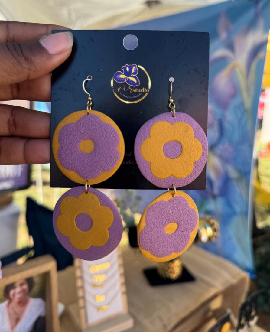 Make a bold statement with these vibrant handmade flower earrings! Featuring two layered blooms per earring in eye-catching color combinations, these playful pieces bring retro-inspired charm and modern flair to any look.